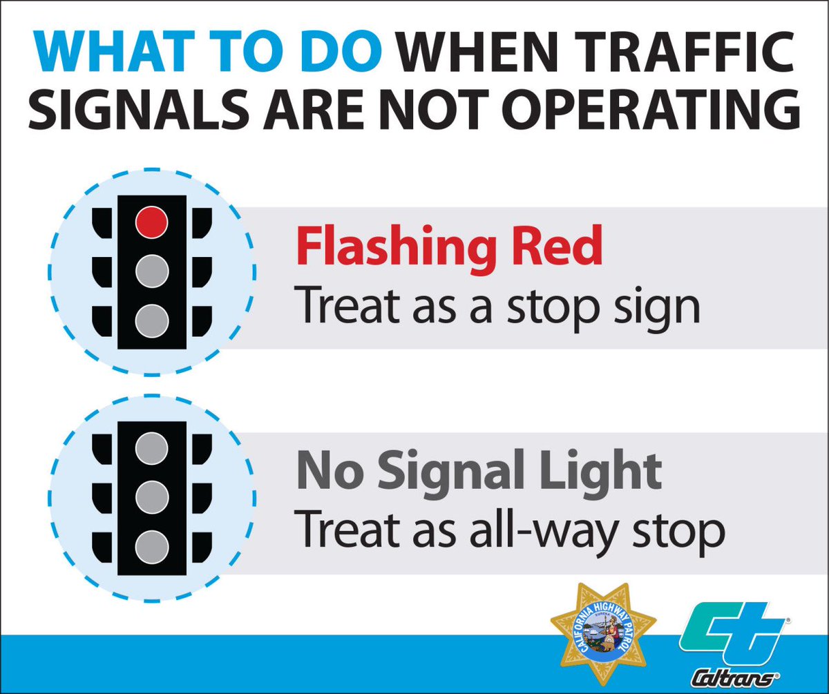 If @PGE4Me shuts off power for safety many traffic signals will go out, too. Non-working (dark) and flashing red traffic signals should be treated as all-way stops during power outages. Proceed with caution through the intersection and observe all right-of-way rules.pic.twitter.com/AlIXCes9fE