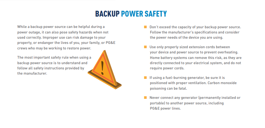 While a backup power can be helpful during an outage, it can also pose safety hazards when not used correctly. Improper use can risk damage to your property, or endanger the lives of you, your family, or PG&E crews who may be working to restore power: http://bit.ly/2OzSM6W  pic.twitter.com/QjRm3iPPlo