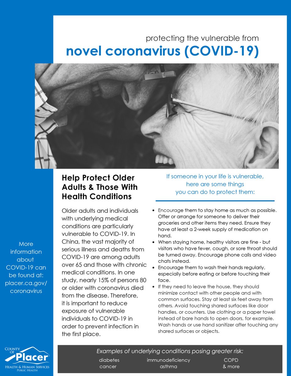 Older adults and individuals with underlying medical conditions are particularly vulnerable to #COVID19. If someone in your life is vulnerable, here are some things you can do to protect them. More resources available at http://www.placer.ca.gov/coronavirus pic.twitter.com/36Z6LV4Y57