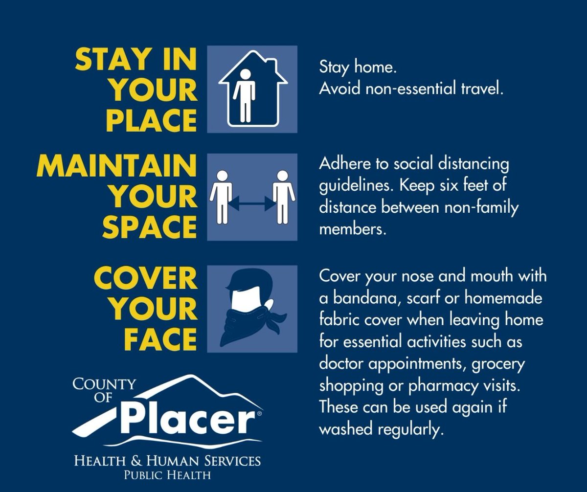 STAY HOME first and foremost, and continue to maintain a distance of six feet or more when you leave the house for essential activities. Face coverings should be used in tandem with, not in place of, other strategies. More info: https://www.placer.ca.gov/6524/Face-coverings-now-recommended-for-publi …pic.twitter.com/oItjW95c0r