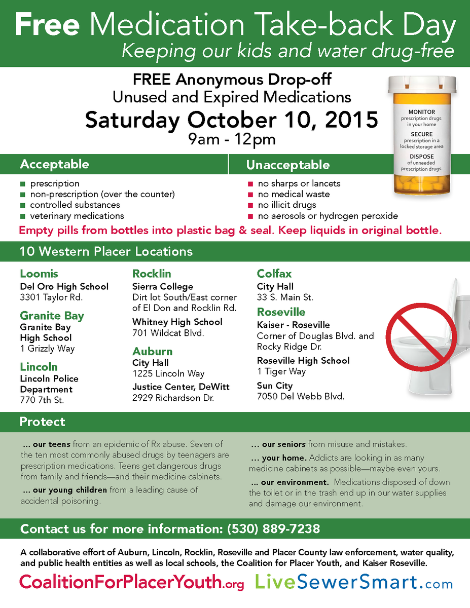 Drop off your expired/unused meds for safe disposal at 10 #PlacerCounty locations Oct. 10: https://www.facebook.com/events/1674752349477711/ …pic.twitter.com/9MO4ua5xux