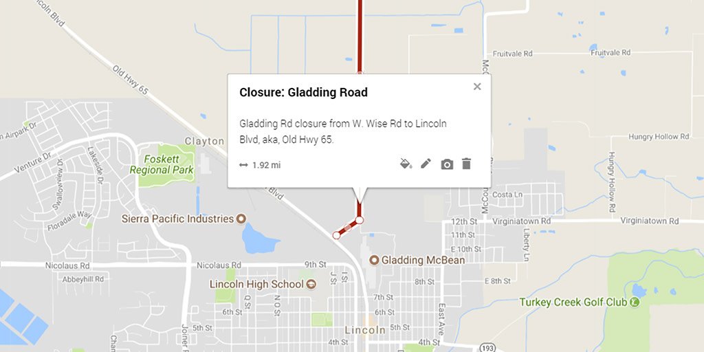 ROAD CLOSURE: A section of Gladding Road, between W. Wise Road and Lincoln Boulevard in @CityofLincolnCA, is closed due to localized flooding. View road closure on Google Maps: https://www.google.com/maps/d/viewer?mid=14c2mK_3aPbGmbL1HAlFSNYPvdW2wdXEz&hl=en&usp=sharing …pic.twitter.com/ArC6oJWCSP