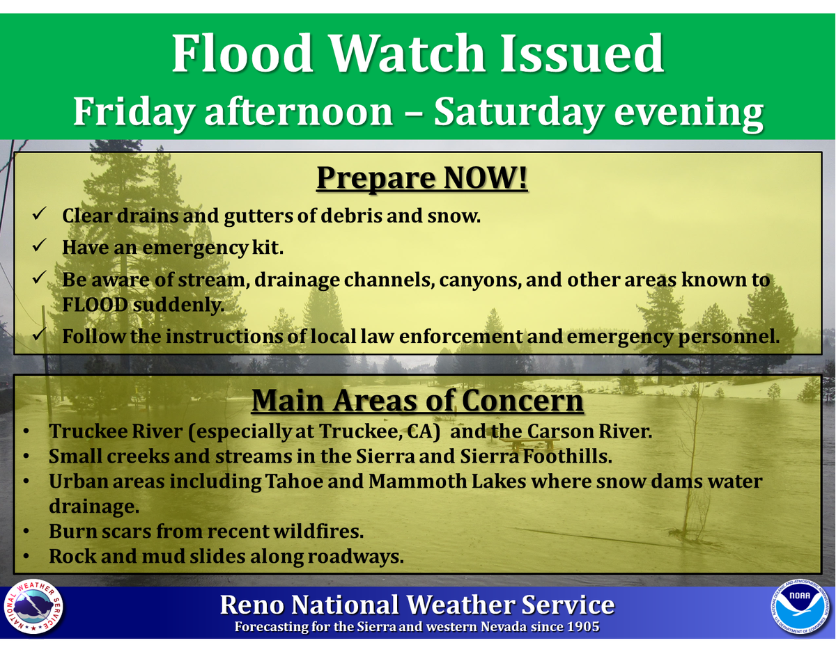A strong atmospheric river will impact the region Friday-Saturday. Significant precipitation & high snow levels will bring an enhanced flooding potential for rivers, creeks, streams and urban areas. Flood preparations should be completed by Thursday afternoon. #CAWx #NVWx pic.twitter.com/W78IvJlcUv