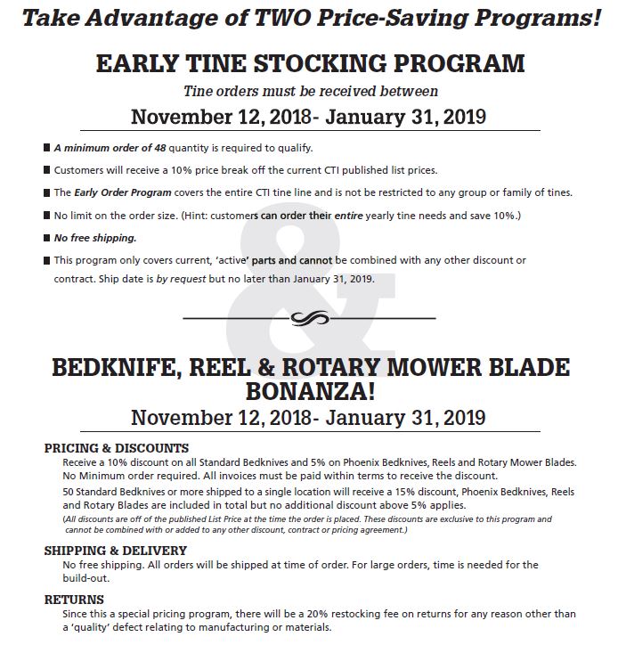 https://mailchi.mp/067c8430f5b7/save-10-now-before-upcoming-price-increases-cti-bedknife-and-tine-bonanza?e=f8c8a7d87b … We have been notified that we will soon be getting a price increase...So get those orders in early (now) even if they are for shipment at a later date – and get the benefit of the current pricing!