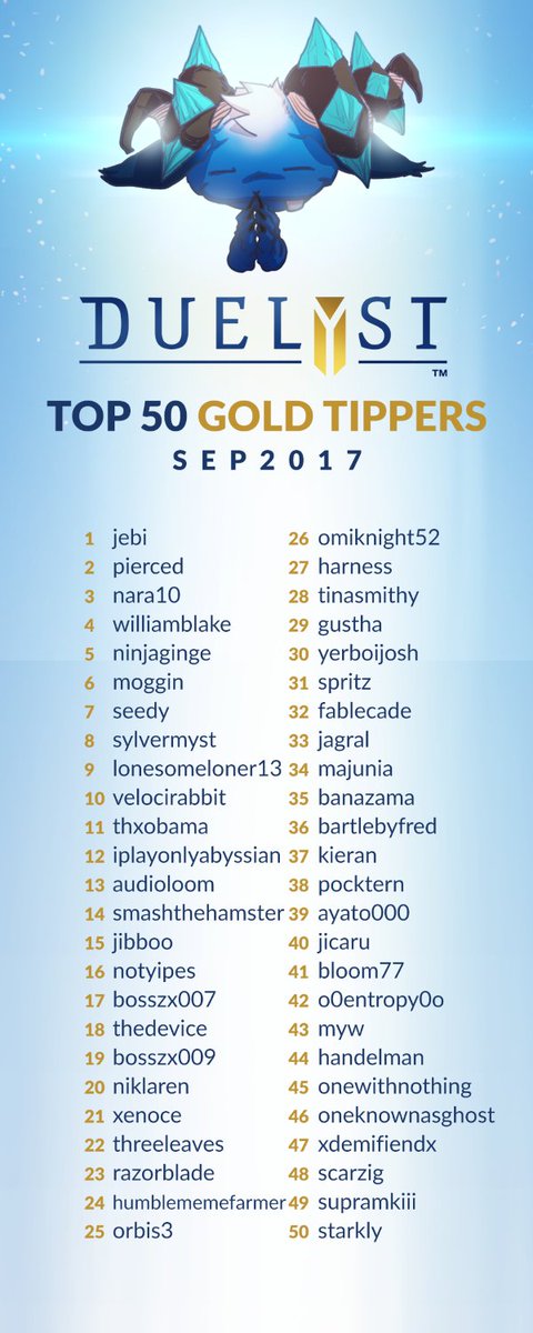 Thanks to the latest Top 50 Gold Tippers for being so generous! 💰 https://duelyst.com/news/top-50-tippers-0917 …pic.twitter.com/r6smYzRVih
