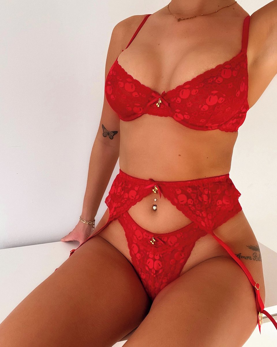 Adorned with cherries and kisses with gorgeous detailing from the Gold cherry on the brief and bra.