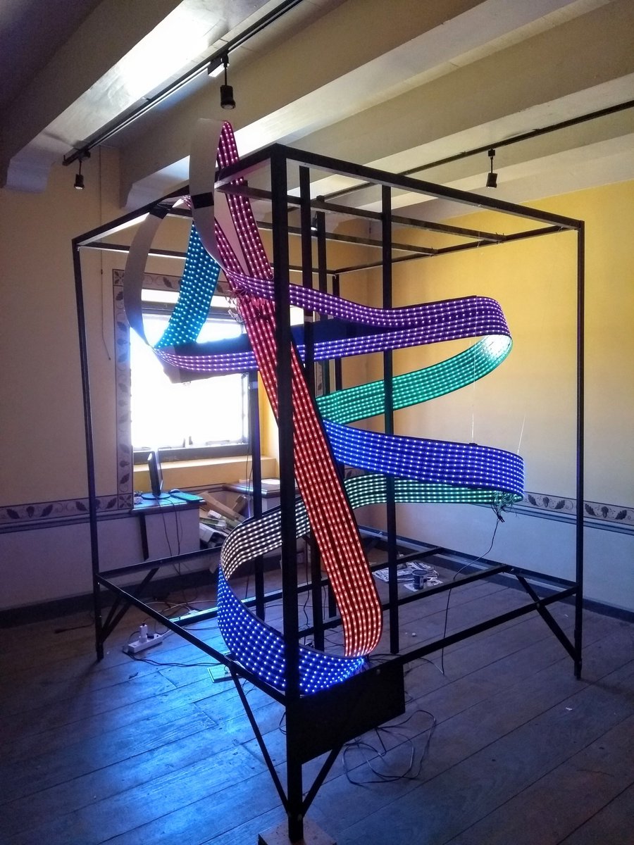 @PlaytopiaSA. 6000 LEDs in a Möbius strip* with a racing game, and all the colors! Our team was Arthur, David (x2), Simon, Claire, Adriaan and myself. It was lots of work to get this done!