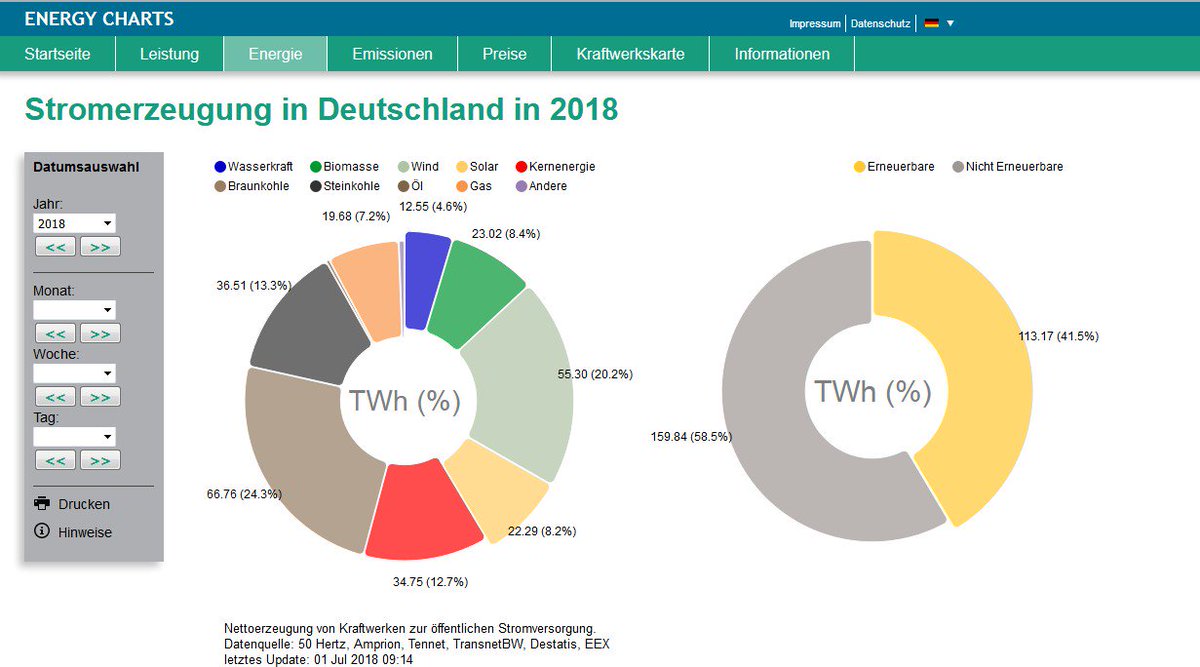 Öffentliche Nettostromerzeugung in Deutschland im ersten Halbjahr 2018: 113,2 TWh Erneuerbar (104.1 TWh in 2017) 159,8 TWh Konventionell (173.1 TWh in 2017) 41,5% Anteil Erneuerbare Energien (37,6% in 2017) https://www.energy-charts.de/energy_pie_de.htm … pic.twitter.com/QVnA0VCiOV