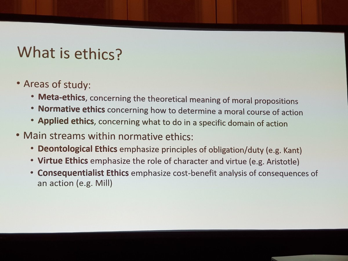 What is #ethics? Which are its areas of study? - Meta-ethics - Normative ethics - Applied ethics Which are the main streams within #normativeethics? 👇 @razzrboy #AI #AIEthics @IJCAIconf #IJCAI_2019pic.twitter.com/oJL3lUamlH