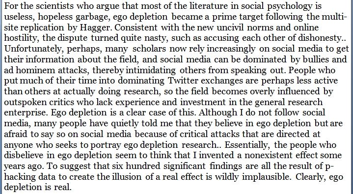 Roy Baumeister argues that Twitter has vilified his brainchild, ego depletion, to a point that believers fell silent, for fear of being shamed. https://psyarxiv.com/uf3cn/ pic.twitter.com/AYYsawqyIr