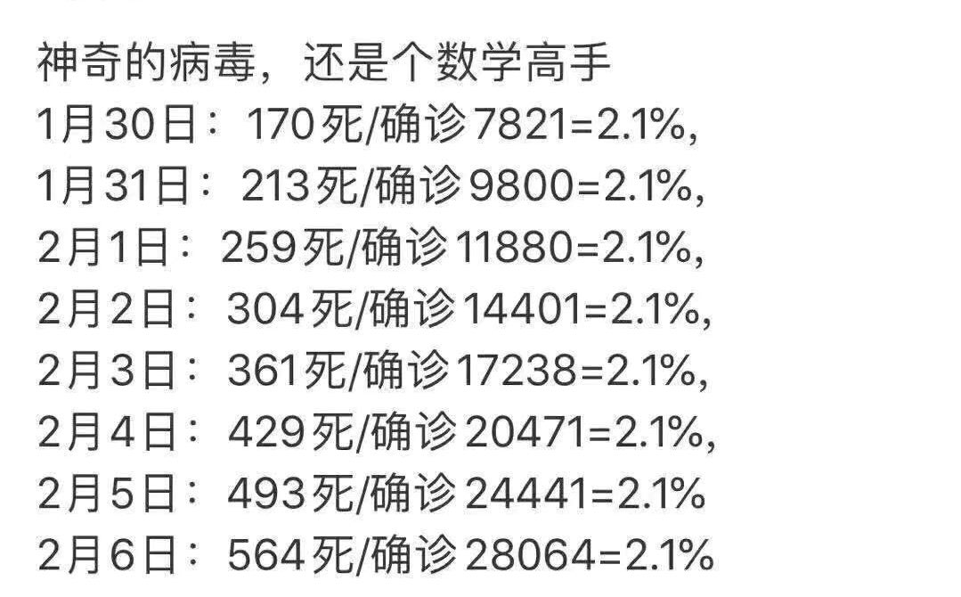 China (as perhaps our own governments as well) does not consider it prudent to report the full extent of China‘s present and our future humanitarian crisis. But at least they are letting us know the mortality estimate. It’s the pattern encoded into two meaningless numbers: 2.1%.