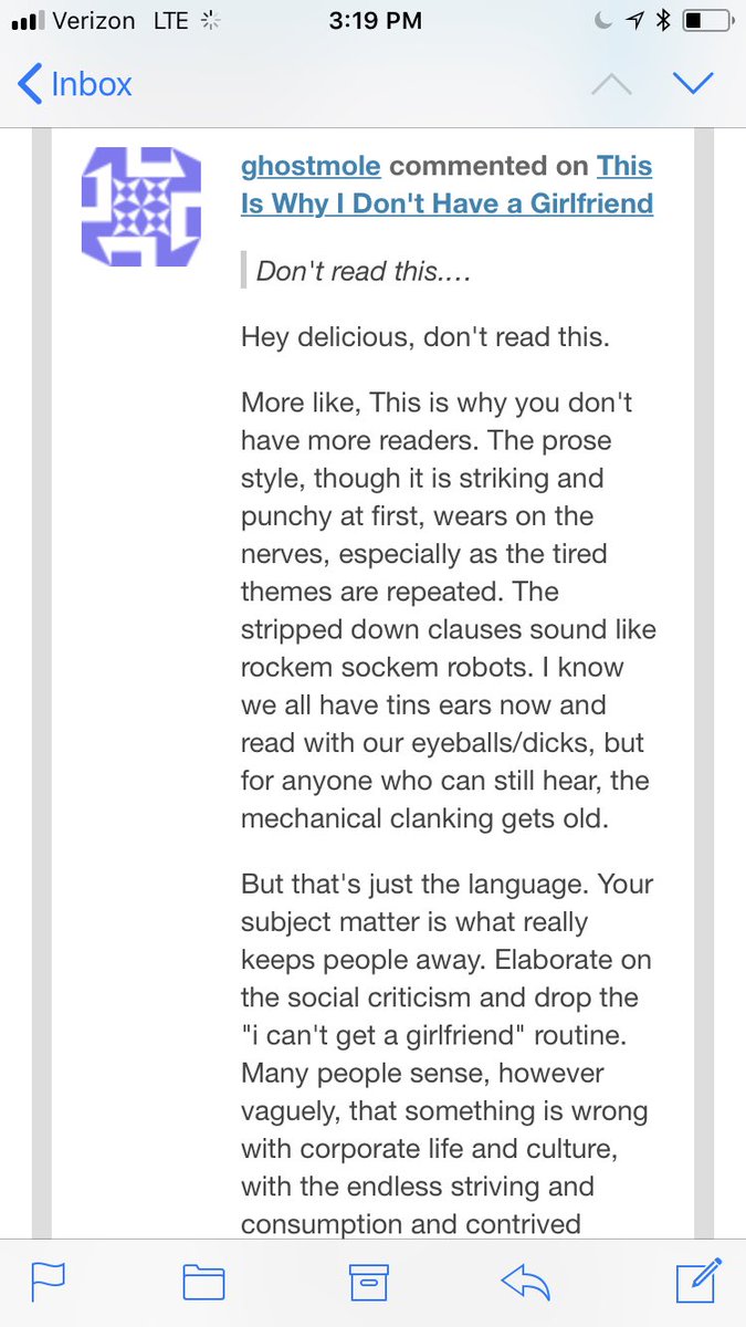 It's sweet that you are vulnerable enough to be hurt by a comment that tells you criticizing corporate culture and consumerism would be more original than reporting on your personal despair