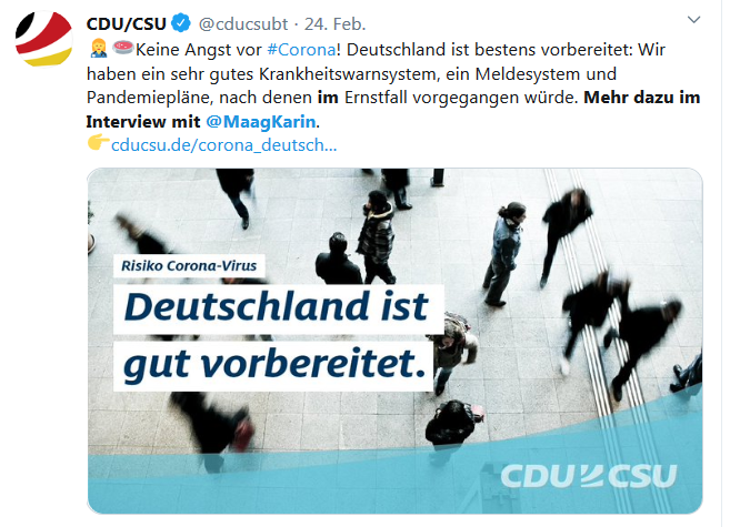 Hier die aktuellen Zahlen nach Ländern - das ist ein Log Scale! Alle schön zwischen 2 und 3 Tagen Verdopplungszeit. Klick mal auf den Play Button. Dabei hätten wir einen Zeit-Vorsprung gehabt, weil Italien hat es ja vorgemacht, wie es *nicht* geht.https://ourworldindata.org/grapher/covid-confirmed-cases-since-100th-case …