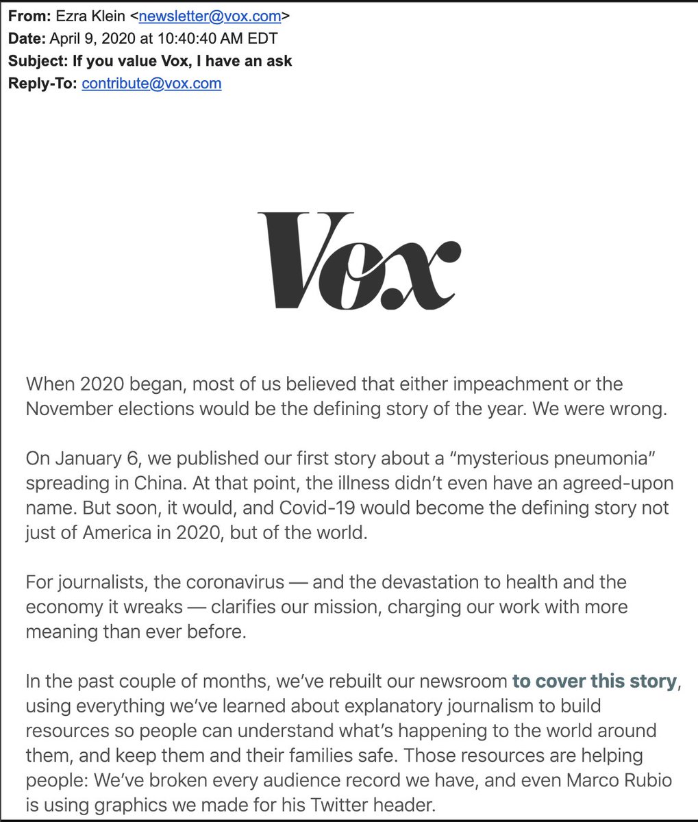 Honestly impressed with Kara & Vox's willingness to straight-up rewrite their disastrous early coverage of the pandemic while asking for money out side of the mouth and chiding other hurting businesses out the other Most people's *most* sociopathic ex couldn't pull this offhttps://twitter.com/Austen/status/1248395562178588680 …