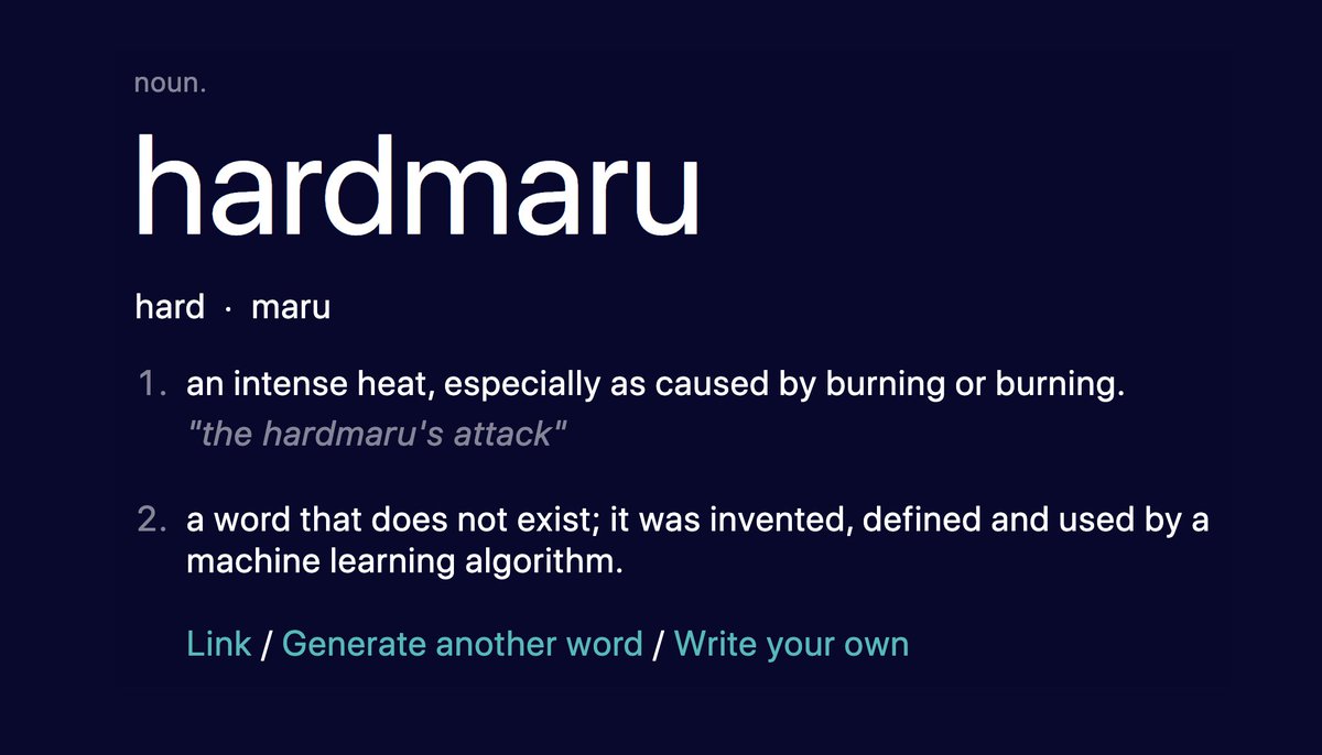 This Word Does Not Exist https://www.thisworddoesnotexist.com/  Fun project where @turtlesoupy trained a GPT-2 language model over the Oxford English Dictionary. Sampling from it, you get realistic sounding words with fake definitions and example usage, e.g.pic.twitter.com/G1u0qjGwat