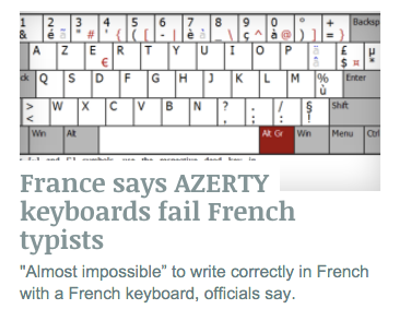 Sacre-woof. France's keyboards are decidedly anti-French. http://arstechnica.com/tech-policy/2016/01/france-says-azerty-keyboards-fail-french-typists/ …pic.twitter.com/3YdJVwa6r7