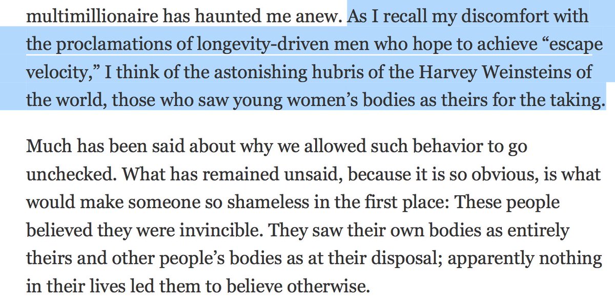 A very bad take by @DaraHorn. The idea of radical life extension is sexist, because... invincibility something something sexual harassment? https://www.nytimes.com/2018/01/25/opinion/sunday/silicon-valley-immortality.html … (Commenters, be polite. You can disagree w/the article, ofc, but if you veer into ad hominem I'll block you)pic.twitter.com/qjXy9tpgF6