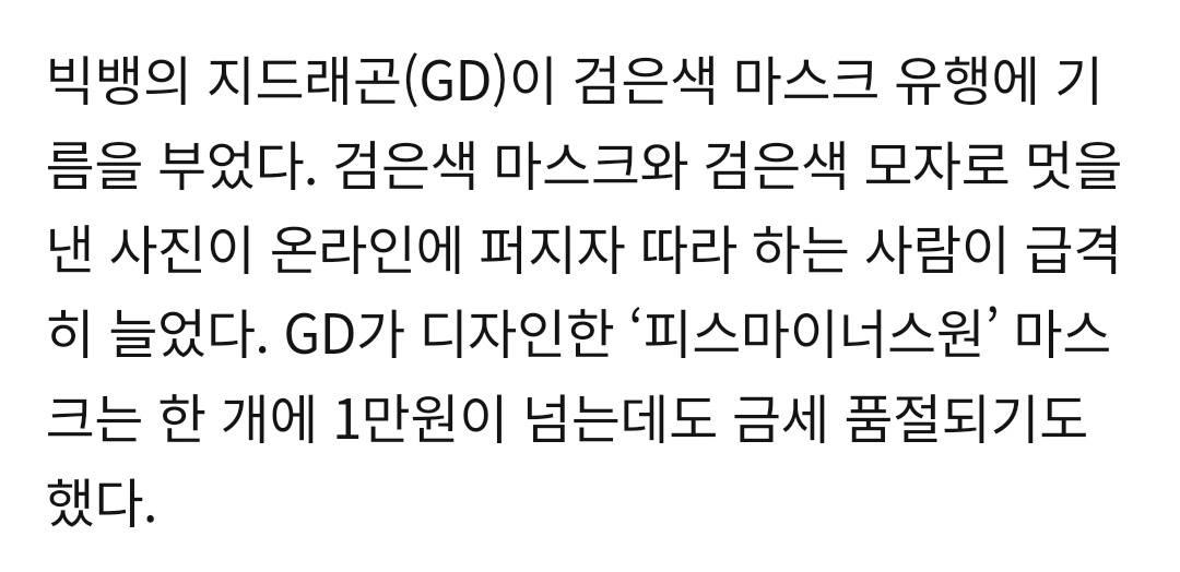 gd fueled the black mask trend. as his pictures spread online wearing black mask and black hat, the number of ppl following suit increased sharply. peaceminusone's black mask quickly sold out even though its price is 10,000 won. http://naver.me/IgowJno7 pic.twitter.com/FibQ4vfd1b