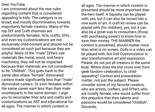 @TeamYouTube Worried to hear that my friends producing art on Youtube may have their incomes reduced by being labeled "child appealing". Arts and crafts are not exclusively for kids. Especially worrying as Youtube has put so much pressure on them to be family friendly in the pastpic.twitter.com/Sem5QApug1