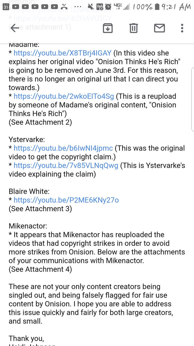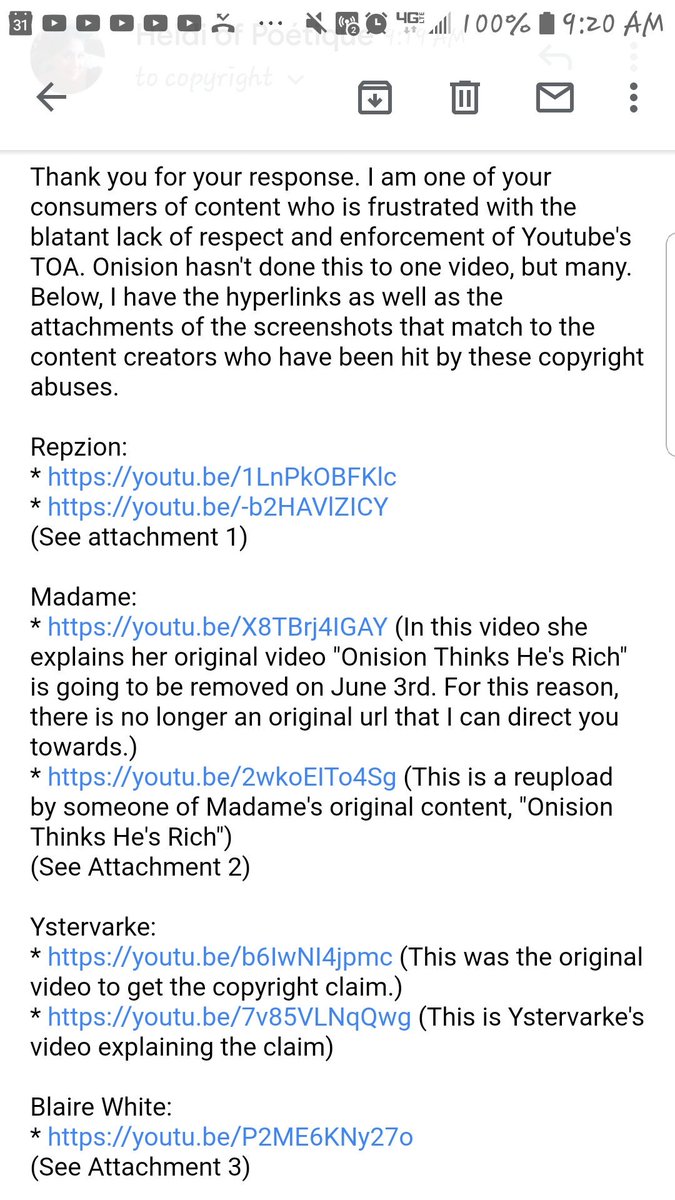 Hey @Mikenactor. I don't know that it will make a difference, but I did reach out to YouTube's copyright team regarding Onision's multiple abuses. I did hear back from them. They wanted the URL of said video in question. Here is the copy of my reply. Waiting their response. pic.twitter.com/LjeirQVIQs