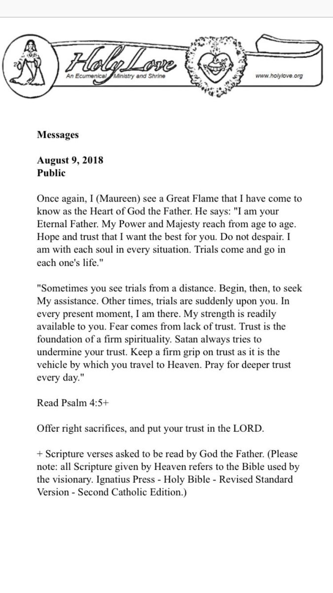 Holy Love 8/9/18-#4-Public God The Father says: "Satan always tries to Undermine your Trust. Keep a Firm Grip on Trust as it is the Vehicle by which you Travel to Heaven. PRAY FOR DEEPER TRUST EVERY DAY." Rd Psalm 4:5+ Offer right Sacrifices, and put your Trust in The LORD.pic.twitter.com/u3PNcI4srf