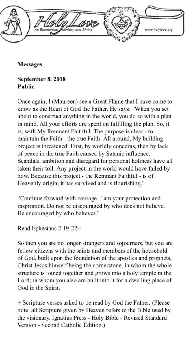 Holy Love 9/8/18-#1 Public God The Father says:"WHEN YOU SET ABOUT TO CONSTRUCT ANYTHING IN THE WORLD, YOU DO SO WITH A PLAN IN MIND. All ur efforts are spent on fulfilling the plan. So, it is, with My REMNANT FAITHFUL. The purpose is clear-to maintain the Faith- the True Faith.”pic.twitter.com/wTkYrWFafP