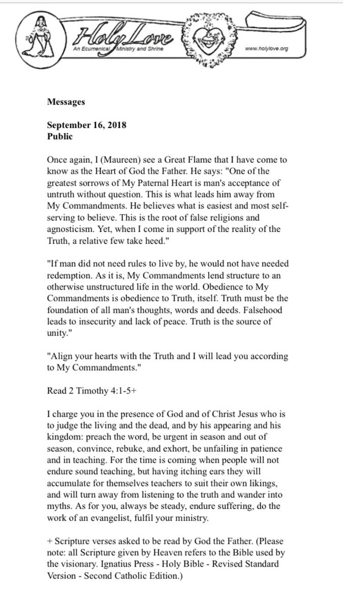 HolyLove 9/16/18-#1-Public God The Father says:"ONE OF THE GREATEST SORROWS OF MY PATERNAL HEART IS MAN's ACCEPTANCE OF UNTRUTH WITHOUT QUESTION. This is what leads him away from My Commandments. He believes what is Easiest&Most Self-Serving to believe.This is D Root of False..”pic.twitter.com/ZpTyXrv9R4