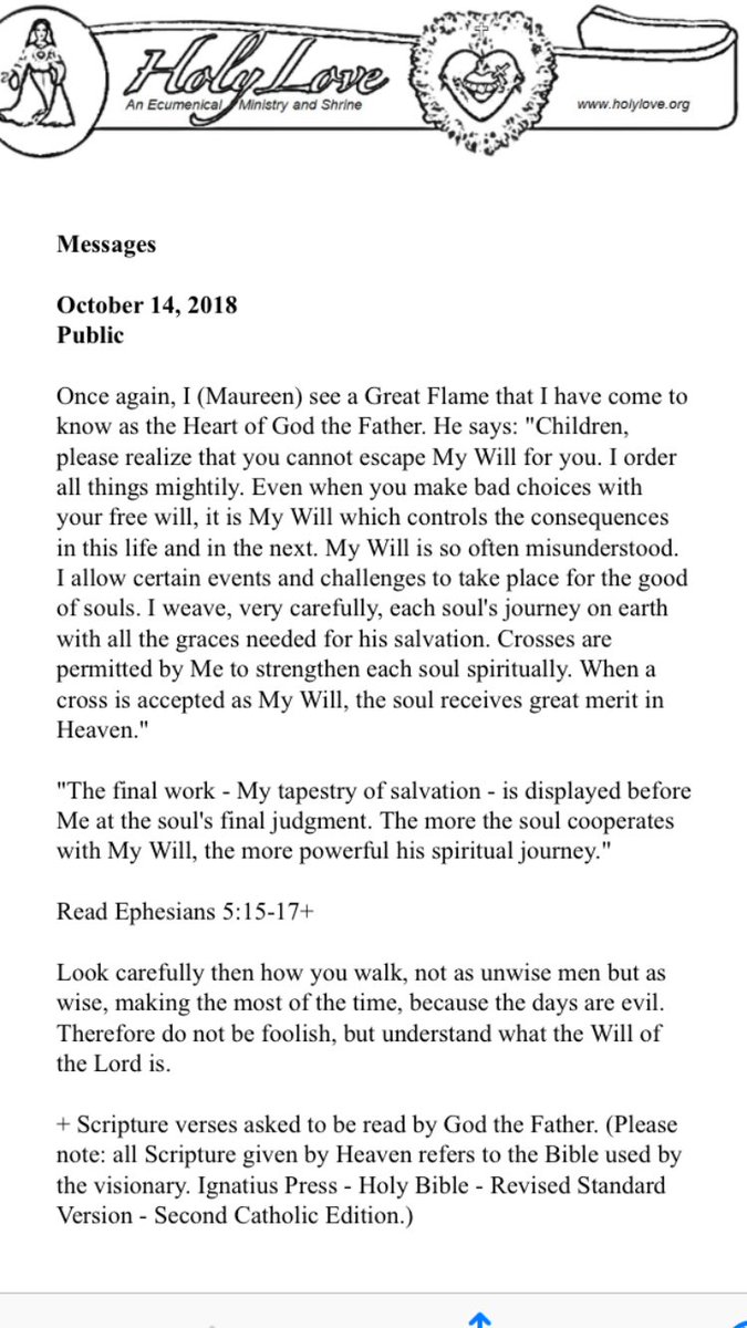 HolyL 10/14/18-#2-God The Father says: "MY WILL IS SO OFTEN MISUNDERSTOOD. I Allow Certain Events and Challenges to take place for the Good of Souls. I Weave, very carefully, each Soul's Journey on Earth with all the Graces Needed for his Salvation. Crosses are Permitted by Me..”pic.twitter.com/esyT5YaWvj