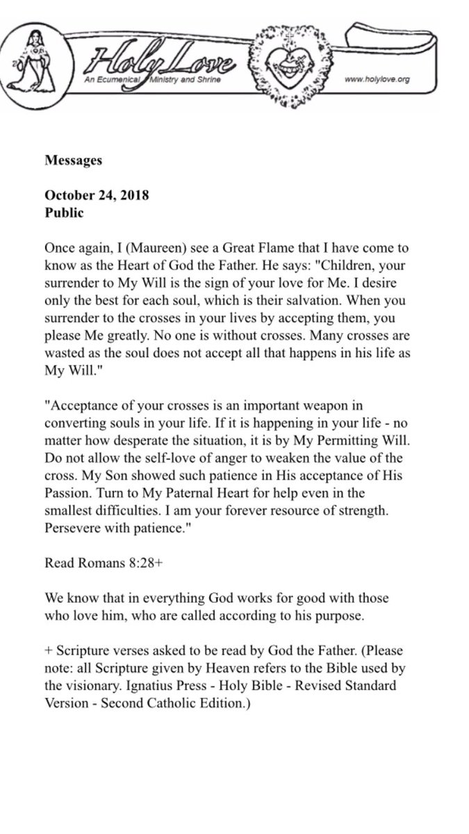 Holy Love 10/24/18-#1 Public God The Father says: "CHILDREN, YOUR SURRENDER TO MY WILL IS THE SIGN OF YOUR LOVE FOR ME. I Desire only the Best for Each Soul, which is their Salvation. When you Surrender to the Crosses in your Lives by Accepting them, you Please Me Greatly.”pic.twitter.com/3Km5QeYfQs
