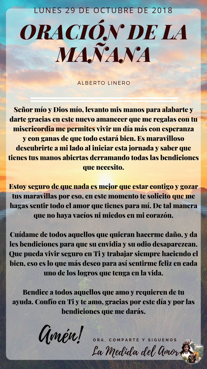 Oración para el lunes 29 de octubre: Haz esta oración para dar gracias a Dios por este lunes que empieza y pídele al Señor que sea Él guiando tus pasos y concediéndote una nueva semana colmada de paz, abundancia, triunfos y bendición. Haz esta oración en: http://www.oracionmilagrosa.com/2016/09/dicha.html …pic.twitter.com/3oYTjmE69U