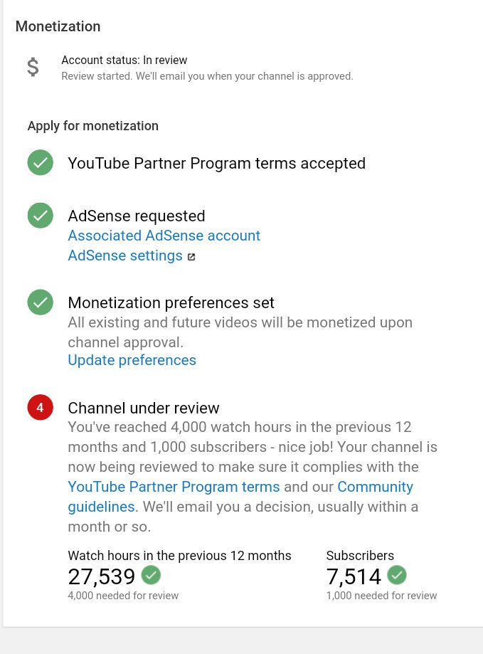 @TeamYouTube dear team you tube i have already completed 4k hour& 1k+ subscribers in previous 365 days But still my channel is under review in 1 month or ago But still my monetization is not enable pls guide us.. Channel link=https://www.youtube.com/channel/UCqyEN1DYFoZPMh8kSbdJF6w …pic.twitter.com/d4rvHJnb1d