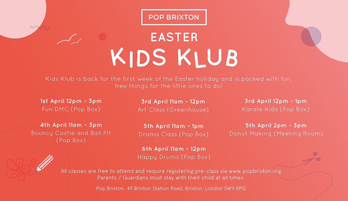 Happy Easter weekend! We're open with our usual trading hours - Open till 12am tonight, 12am Saturday, 11pm Sunday and 11pm Monday, with loads to do, eat and see for the whole family. Full line up of events: https://www.popbrixton.org/events/ pic.twitter.com/IWZMuEdAi7