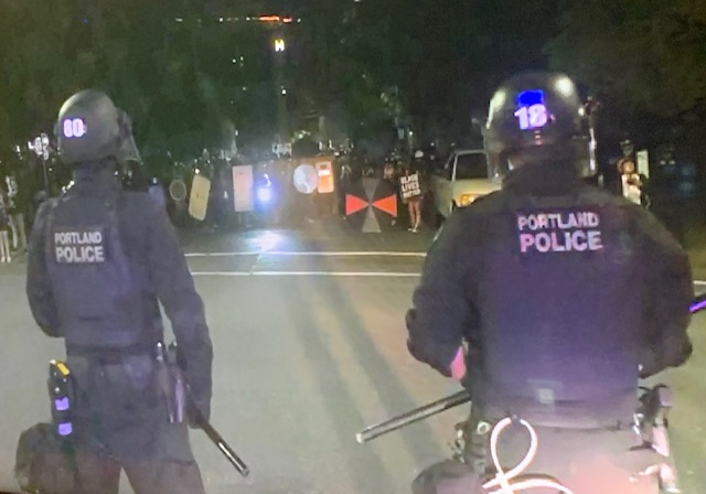 People in this unlawful assembly have thrown glass bottles at Portland Police and directed lasers at them. Anyone who does not disperse may be subject to force or arrest.