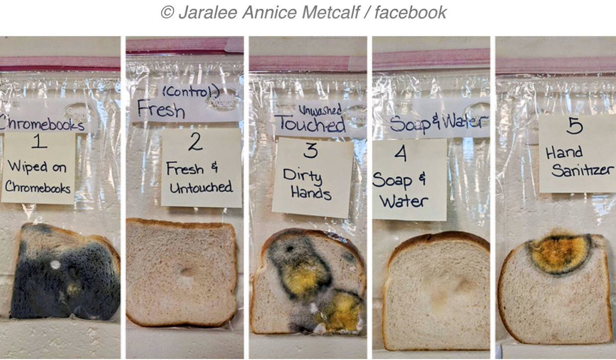 Teacher asked several kids with various levels of hand #cleanliness to touch 5 pieces of white bread that were taken from the same loaf, at the same time