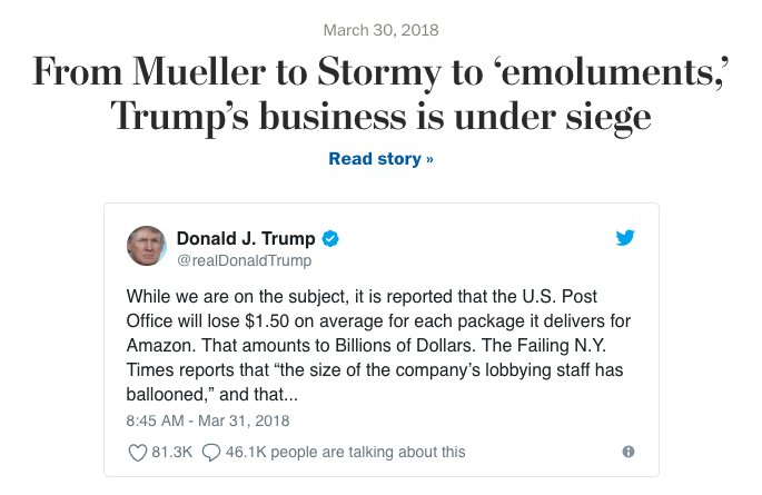 The Washington Post stories that preceded Trump’s tweets about Amazon https://wapo.st/2EmVJPw pic.twitter.com/ByaStGn8On
