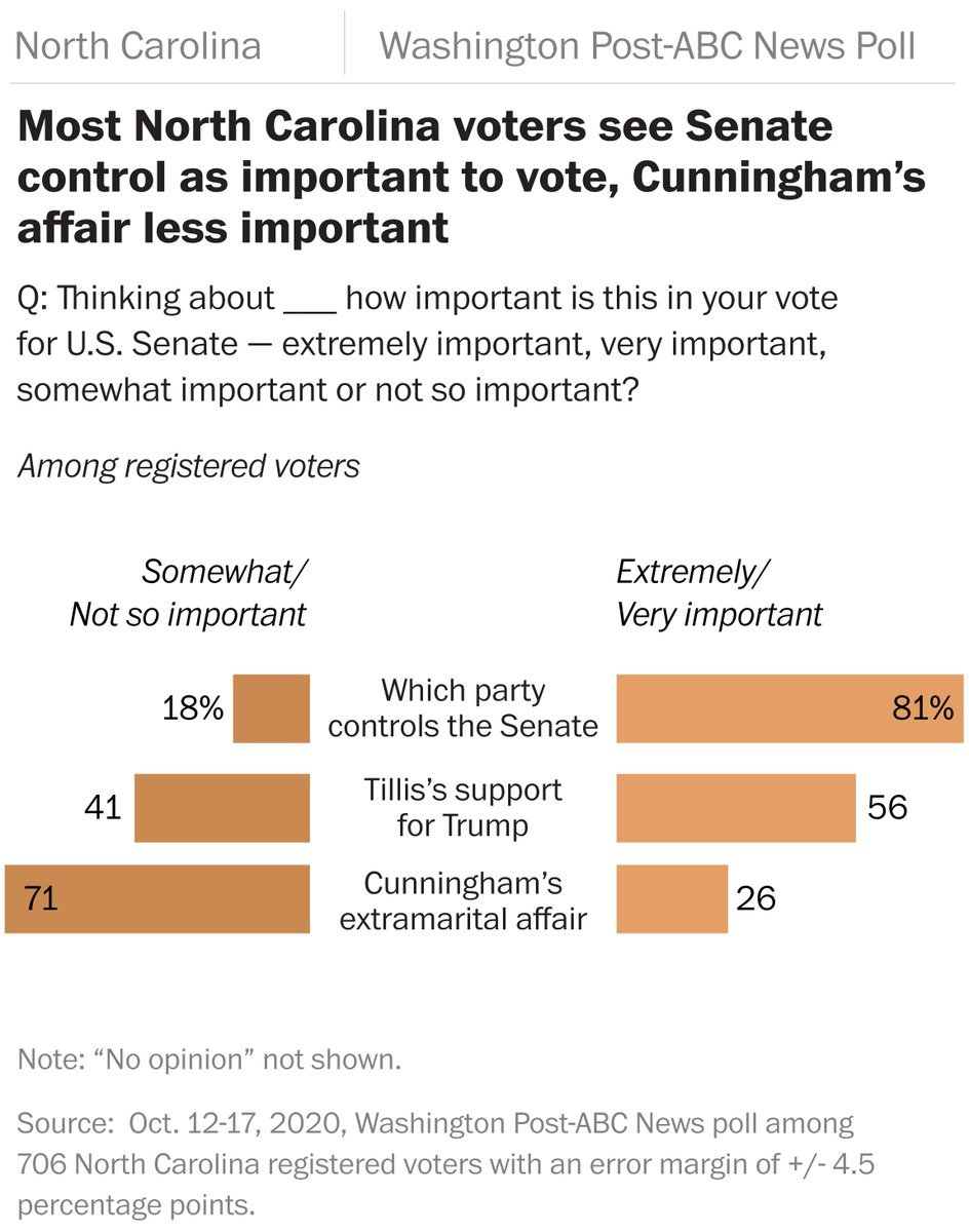 U.S. Senate race in N.C. is tight, with partisan views and Trump outweighing Cunningham scandal, Post-ABC poll finds https://wapo.st/3o2d9ZA pic.twitter.com/3oOS8dwZWv