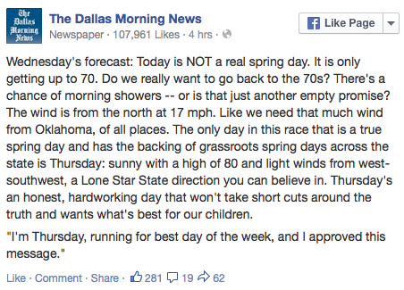 @Poynter@JuddLegum The daily-ish weather posts on@dallasnews' FB are by digital communities manager@landauer_m. Fans love them. -