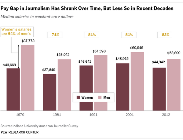 @Poynter: The median salary of women journalists is 83 percent of male counterparts’ pay: http://bit.ly/1k8pJkA pic.twitter.com/9jJtxqIGAk”