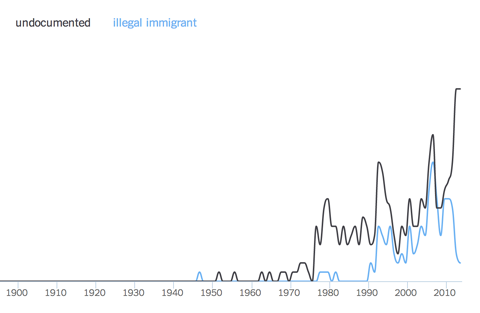 In 2013, NYT started using the term “illegal immigrant” less, and “undocumented” a lot more http://bit.ly/1rDEZuB pic.twitter.com/WThZhj894M