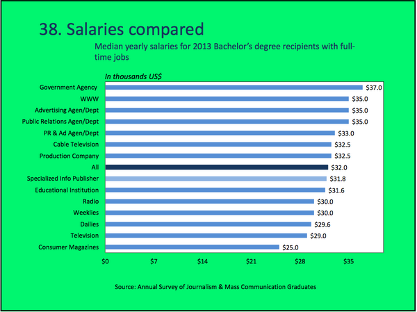 “@Poynter: The median salary for 2013 journalism/mass communication grads was $32,000: http://bit.ly/1swFRiH pic.twitter.com/jKNJHxB0Kx" ok