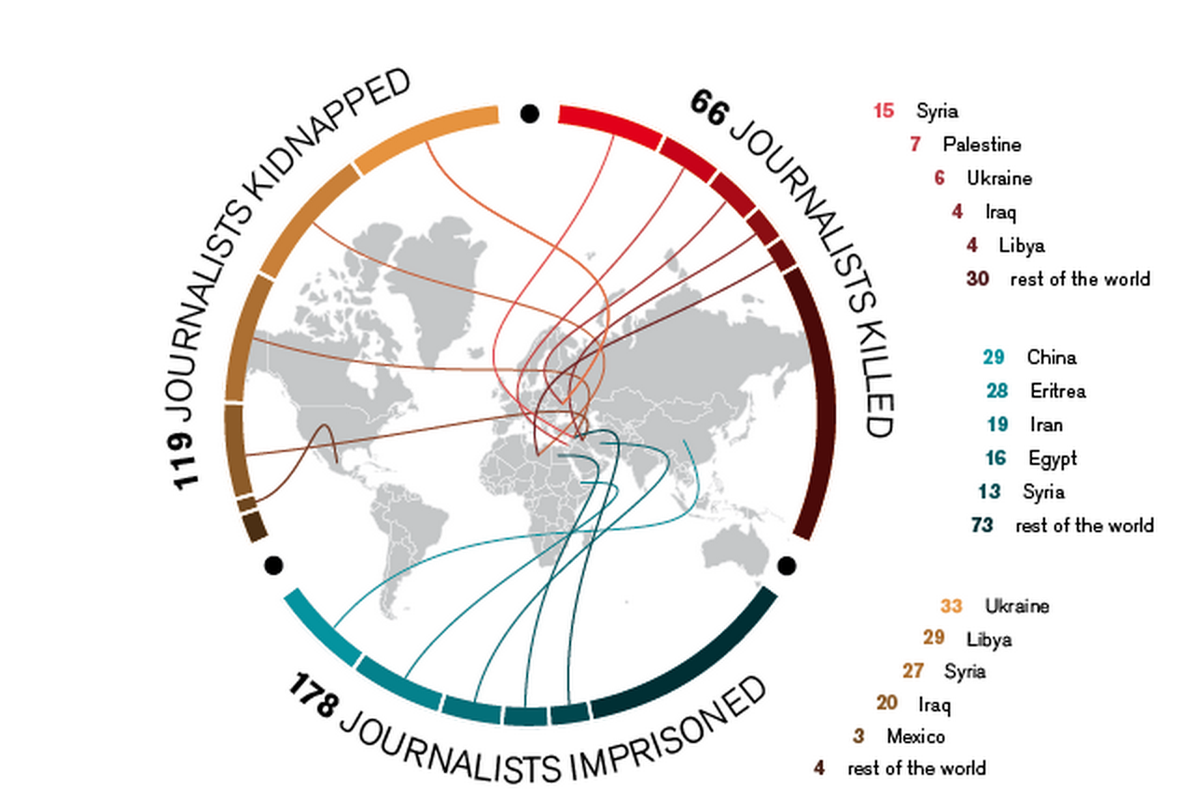 In 2014, 66 journalists were killed, 119 kidnapped, 853 arrested http://www.poynter.org/news/mediawire/308709/in-2014-66-journalists-were-killed-119-kidnapped-853-arrested/ … from @RSF_RWB's latest reportpic.twitter.com/K6i9G9jNtj