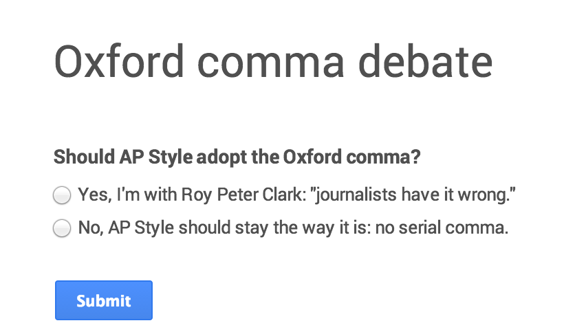 @Poynter: In June, ICYMI,@RoyPeterClark stirred up the Oxford comma debate. http://www.poynter.org/how-tos/journalism-education/256443/ap-style-should-adopt-the-oxford-comma/ … pic.twitter.com/unsPlBdAkN”@SocialKimLy
