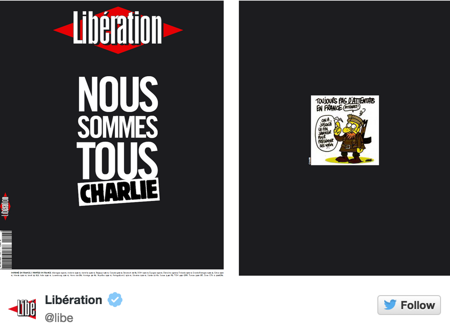Je suis Charlie “@Poynter: "Nous Somme Tous Charlie" #CharlieHebdo http://www.poynter.org/news/mediawire/310943/nous-somme-tous-charlie-journalists-react-to-the-shootings-at-charlie-hebdo/ … pic.twitter.com/Zi8PEj8Ek4”