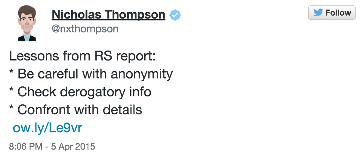 “@Poynter: "Here we go." http://www.poynter.org/news/mediawire/332709/here-we-go-journalists-react-to-and-find-lessons-in-rolling-stones-failures/ … Journalists react to and find lessons in Rolling Stone’s failures pic.twitter.com/3yCPPuWSG8”