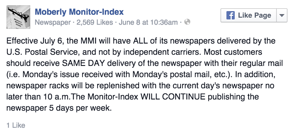 A Missouri newspaper will start using mail carriers instead of newspaper carriers http://www.poynter.org/news/mediawire/350291/missouri-newspaper-will-use-mail-carriers-instead-of-newspaper-carriers/ …pic.twitter.com/4Qosevt0x4