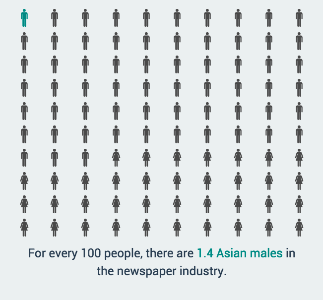 For every 100 people, there are 1.4 Asian males in the newspaper industry. More stats on: http://www.poynter.org/news/mediawire/361641/interactive-find-out-how-diverse-the-newspaper-industry-is/ …pic.twitter.com/tBSTHIgTeq