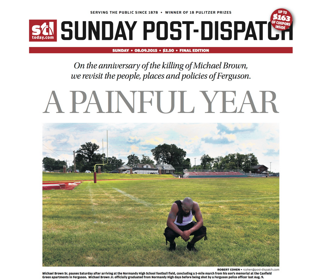 From today's @stltoday front page http://www.poynter.org/news/mediawire/363871/st-louis-post-dispatchs-front-page-on-ferguson-1-year-later/ … plus a look back at #Ferguson fronts from the last yearpic.twitter.com/grUrZpgepv