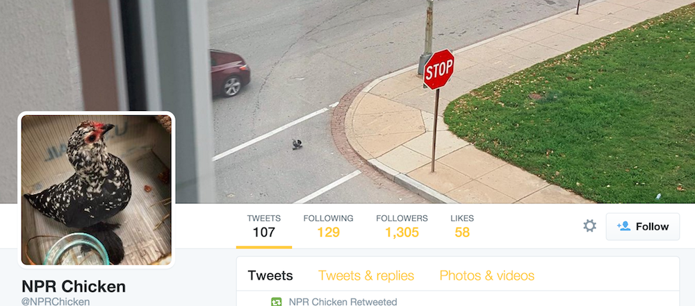 NPR’s "demure urban chicken" has a decent Twitter following http://www.poynter.org/news/mediawire/384389/nprs-demure-urban-chicken-has-a-decent-twitter-following/ …pic.twitter.com/8DEkLGeEQK