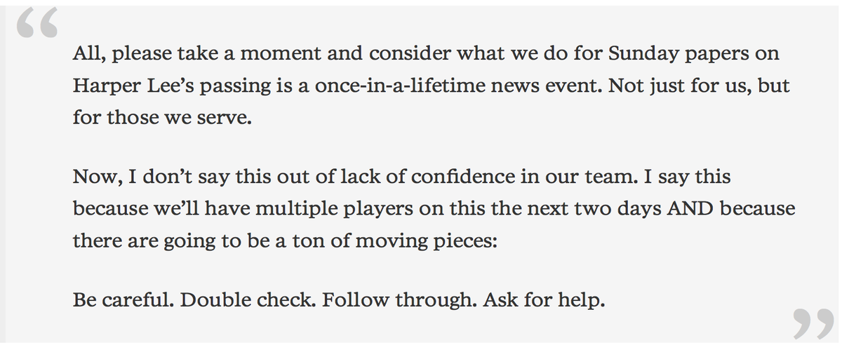 Early on Friday the news editor for The Birmingham News sent this note to his newsroom http://www.poynter.org/2016/how-the-birmingham-news-broke-and-told-the-story-of-harper-lees-death/397995/ …pic.twitter.com/NVuIiSBdOY