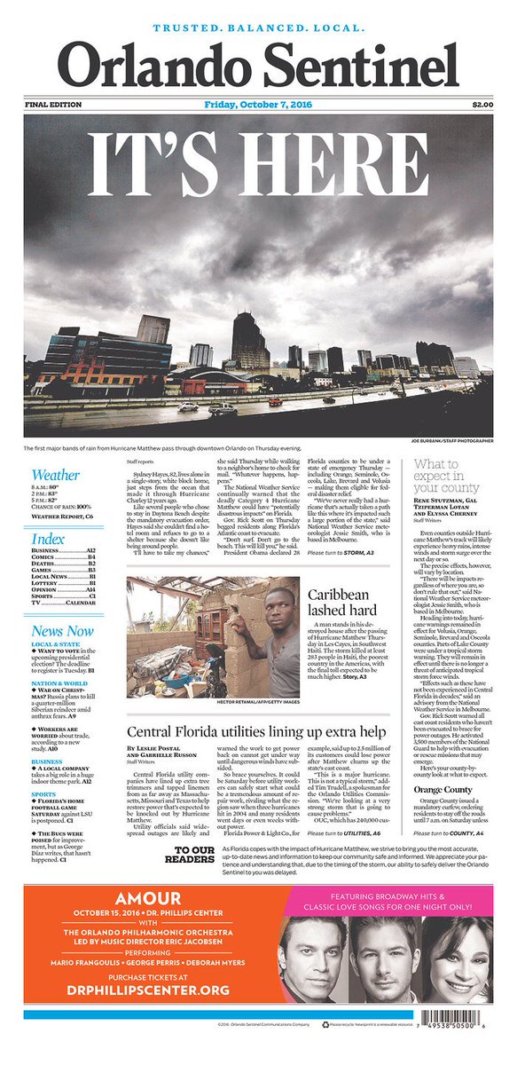 Front pages today from Florida: "It's here" http://www.poynter.org/2016/florida-newspapers-on-hurricane-matthew-its-here/433779/ … #HurricaneMatthewpic.twitter.com/ybJ94sXc0n